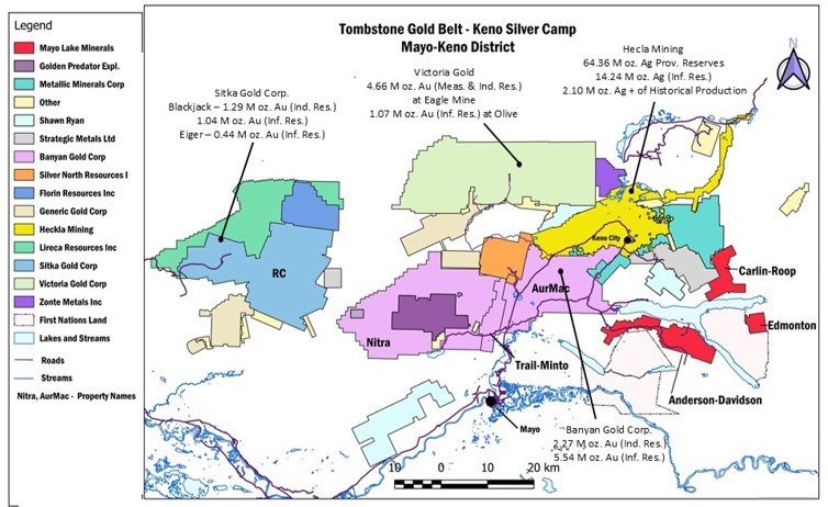 Mayo is actively engaged in the exploration, discovery and development of three precious metal properties covering 145.6 square kilometres in the Mayo- Keno area of the Mayo Mining District. All properties lie within the traditional territory of the Na-Cho Nyäk Dun First Nation. The Mayo-Keno area lies within the Tombstone Gold Belt, where Reduced Intrusion Related Gold Deposits are attracting exploration and mine development, witness Victoria Gold’s Eagle gold mine, Hecla Mining’s silver mines at Keno and projects being actively moved forward toward mine development by Banyan Gold, Sitka Gold, and Snowline Gold.