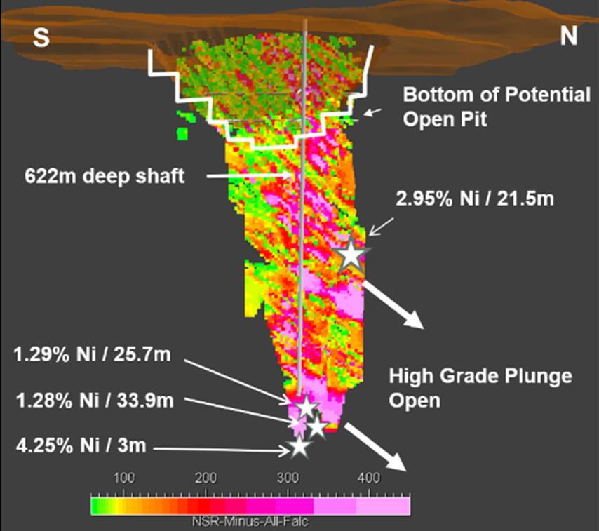 (Figure 1. The geological block model for the Kenbridge Nickel Deposit illustrating high grade nickel drill hole intersections from previous drilling campaigns. Image via Tartisan Nickel Corp.)